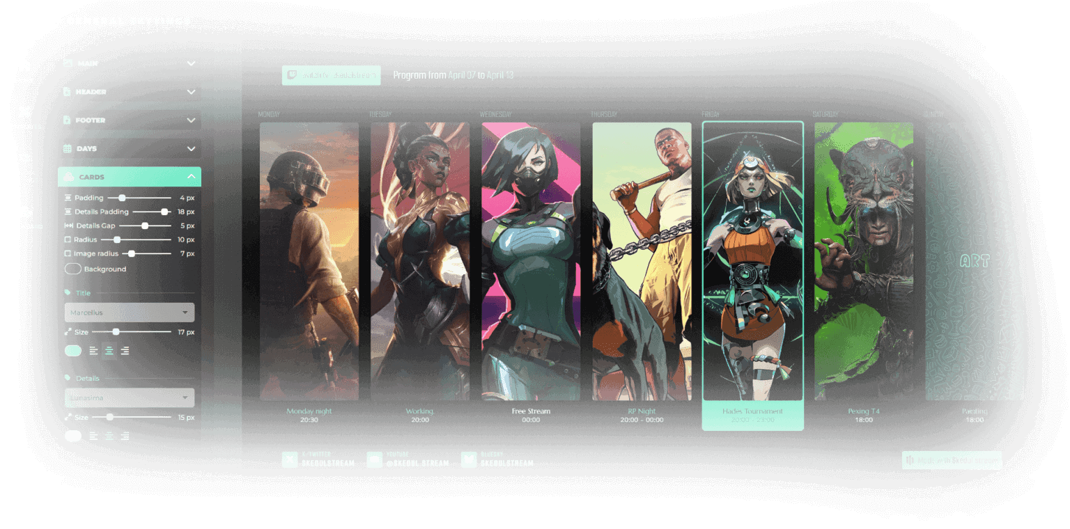 Quickly create your planning with our online Stream Schedule Creator,then share it instantly with your community on social media and directly on our platform.