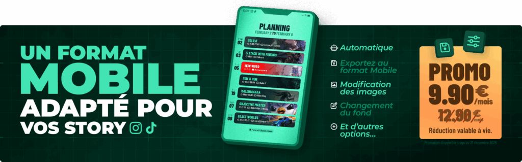 Afin de pouvoir diffuser votre planning de stream sur vos réseaux sociaux orientés Mobile comme Instagram ou Tiktok, vous pouvez dès maintenant exportez votre planning de Stream au format mobile en 1 clic, directement depuis notre Studio de Création.
