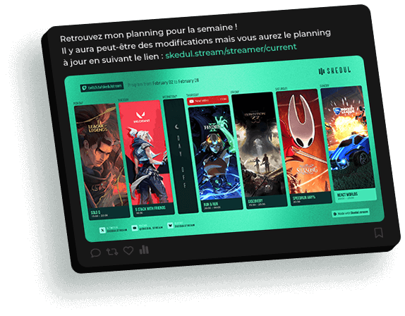 X, Bluesky, Discord, Instagram et autres. Partagez le lien sur vos réseaux sociaux et offrez à votre communauté un accès direct à une version optimisée de votre planning, que ce soit sur desktop, tablette ou mobile.